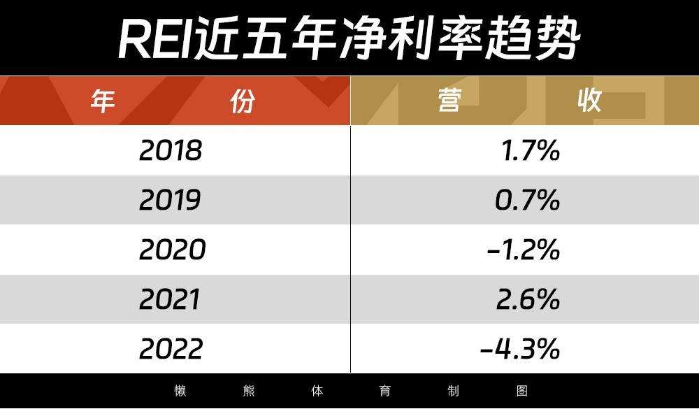 同一年,户外巨头Columbia 的营收约为30亿美元,净利润率10%。利润微薄的情况下稍有不慎就有可能亏损,疫情肆虐的2020年,合作社就告亏损。虽然在2021年REI借助疫情后的报复性运动消费潮,销售收入大增36%,净利润达到了创纪录的9800万美元,但风头过去,2022年合作社又陷入亏损,今年三月,REI宣布返利以后将被称为“合作社会员奖励”,返利也取消了返还现金的选项。