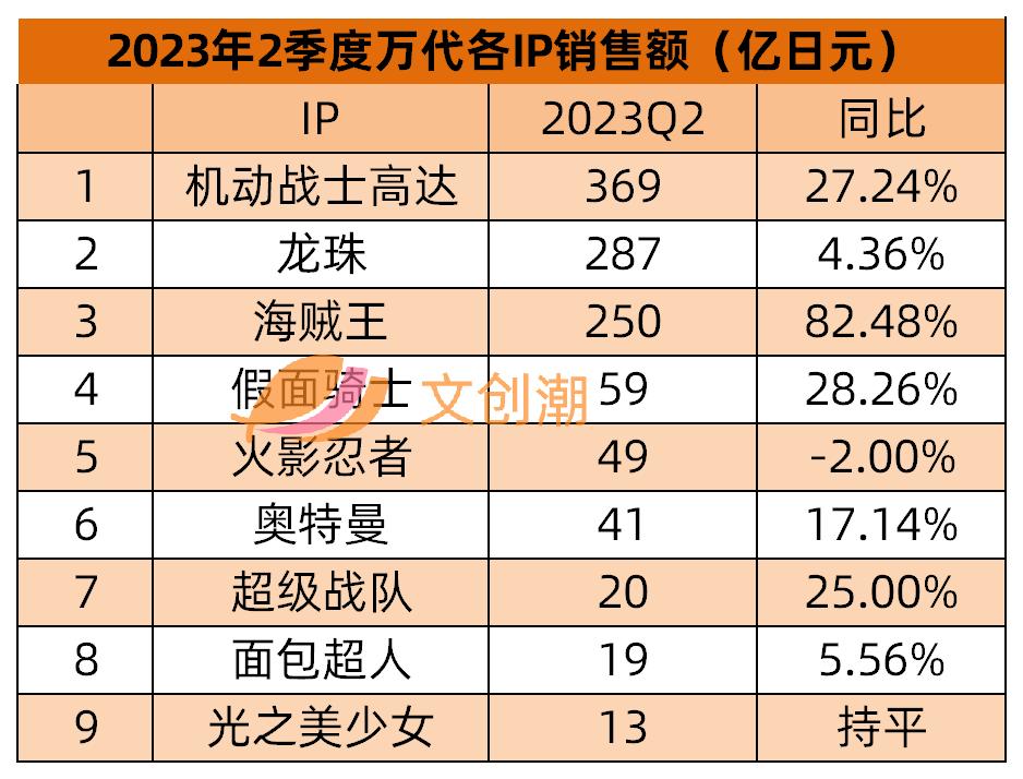 万代披露了九大IP表现,第一位依旧是《机动战士高达》,销售额369亿日元,同比增长27.2%,刷新季度历史销售记录。