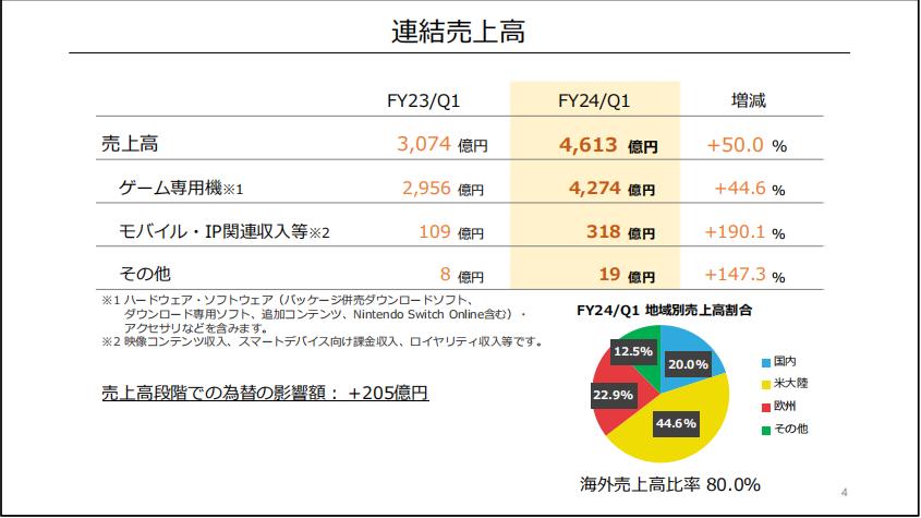 2023年第2季度,任天堂的销售额4613.41亿日元,同比增长50%,海外销售额占比高达80%;纯利润1810.19亿日元,同比增长52.1%。