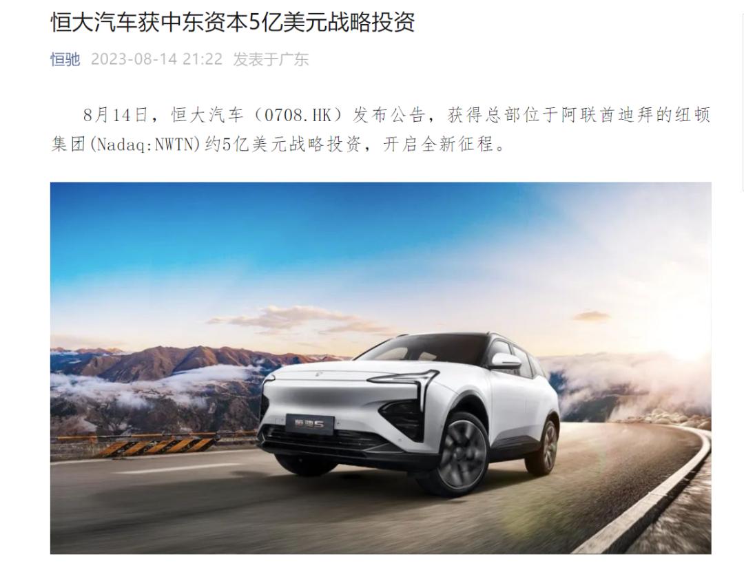 恒大汽车发布公告,获得总部位于阿联酋迪拜的纽顿集团(NWTN集团)约5亿美元战略投资,另有6亿人民币过渡资金将自公告后5个工作日开始陆续到账。所有战投资金全部用于恒大汽车天津工厂,确保恒驰5的正常生产和恒驰6、7的陆续量产。