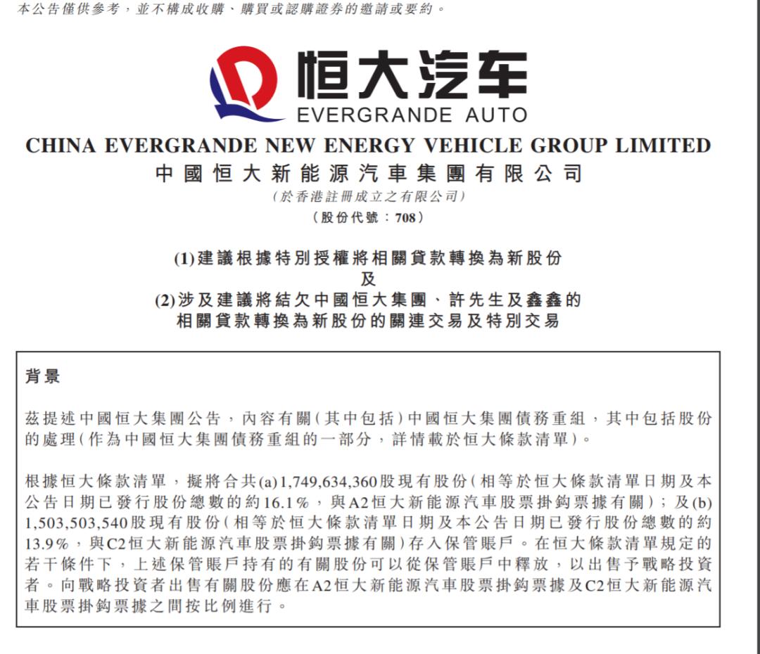 此外,恒大汽车发布公告称,作为中国恒大集团债务重组的一部分,以及为降低恒大汽车的债务水平,将总额208亿多港元的相关贷款按每股3.84港元的转换价转换为新股份。
