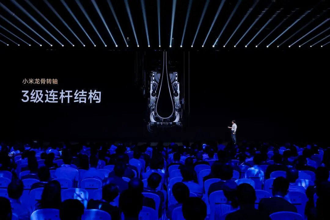 心心念念中,也终于迎来了本场发布会的重头戏:龙骨转轴。据介绍,龙骨转轴创新式设计了多达 14 个可互动关节,3 级连杆设计,能够完美贴合屏幕曲率,带来细腻开合质感的同时,有效降低由于跌落造成的屏幕损坏风险。