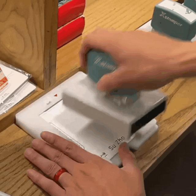 在草稿纸上调整印章角度和印泥颜色的深浅后,再小心翼翼地在盖章本上比画好位置,快而稳地垂直印下。