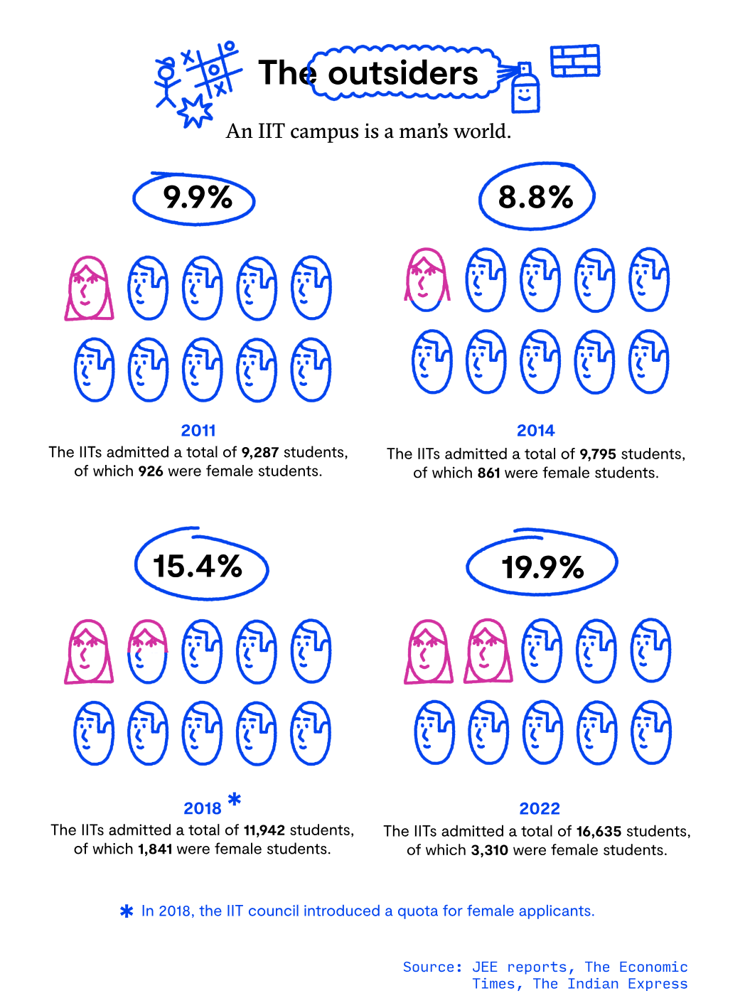 Shruti 是批发初创企业 ApnaKlub 的首席执行官,她是在 2008 年开始在印度理工学院德里分校学习的。她表示,自己是三年级 500 名学生当中约 80 名女性的一员。校园是她找到朋友、配偶并且经历“大发展”的地方,但这里也是她遭遇厌女症的地方。Shruti表示: “从第一天起,女性就成为了校园里的焦点,他们对我们的感受完全漠不关心”。她回忆起一年级学生杂志是这名向新生介绍的:“印度理工学院德里分校的黑话……其中之一是‘校园里有男性,也有非男性’——他们不讲女性。”