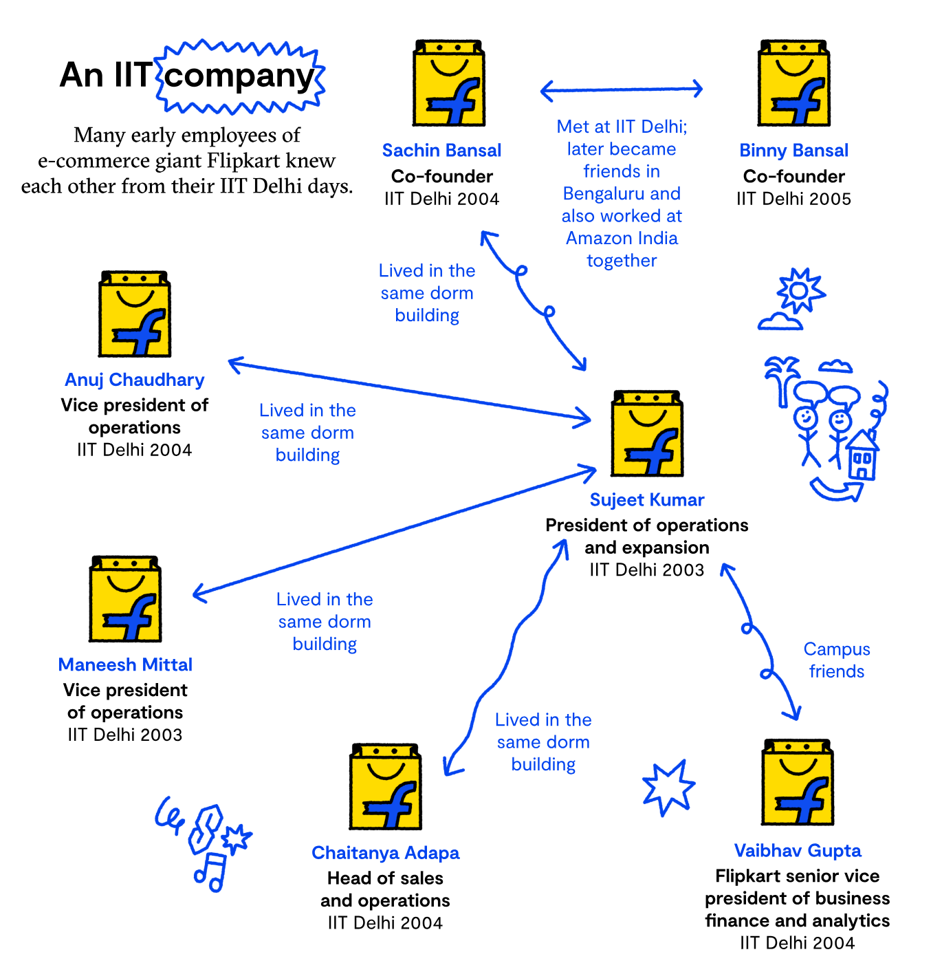 2007 年创立 Flipkart 后,他们聘请了许多印度理工学院的校友。早期员工Sujeet Kumar 与Sachin Bansal曾住在同一栋宿舍楼里。谈到两人的结缘,Kumar说,有一天,Bansal打电话给他,问他要不要加入他的图书销售初创企业。他后来成为了 Flipkart 的运营总裁。