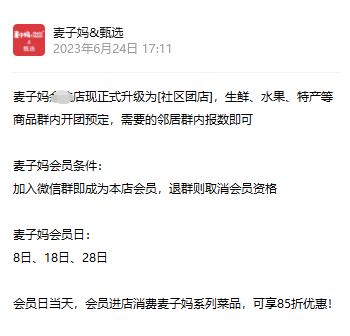 预制菜洞察注意到,位于杭州的一家麦子妈门店已经升级为了社区团店。消费者加入微信群就可以成为门店的会员,享受会员福利。团长会在微信群发布存货、到货情况,开团成功后消费者可以到店自提。麦子妈开团店,更像是一种“门店+线上群”的模型。