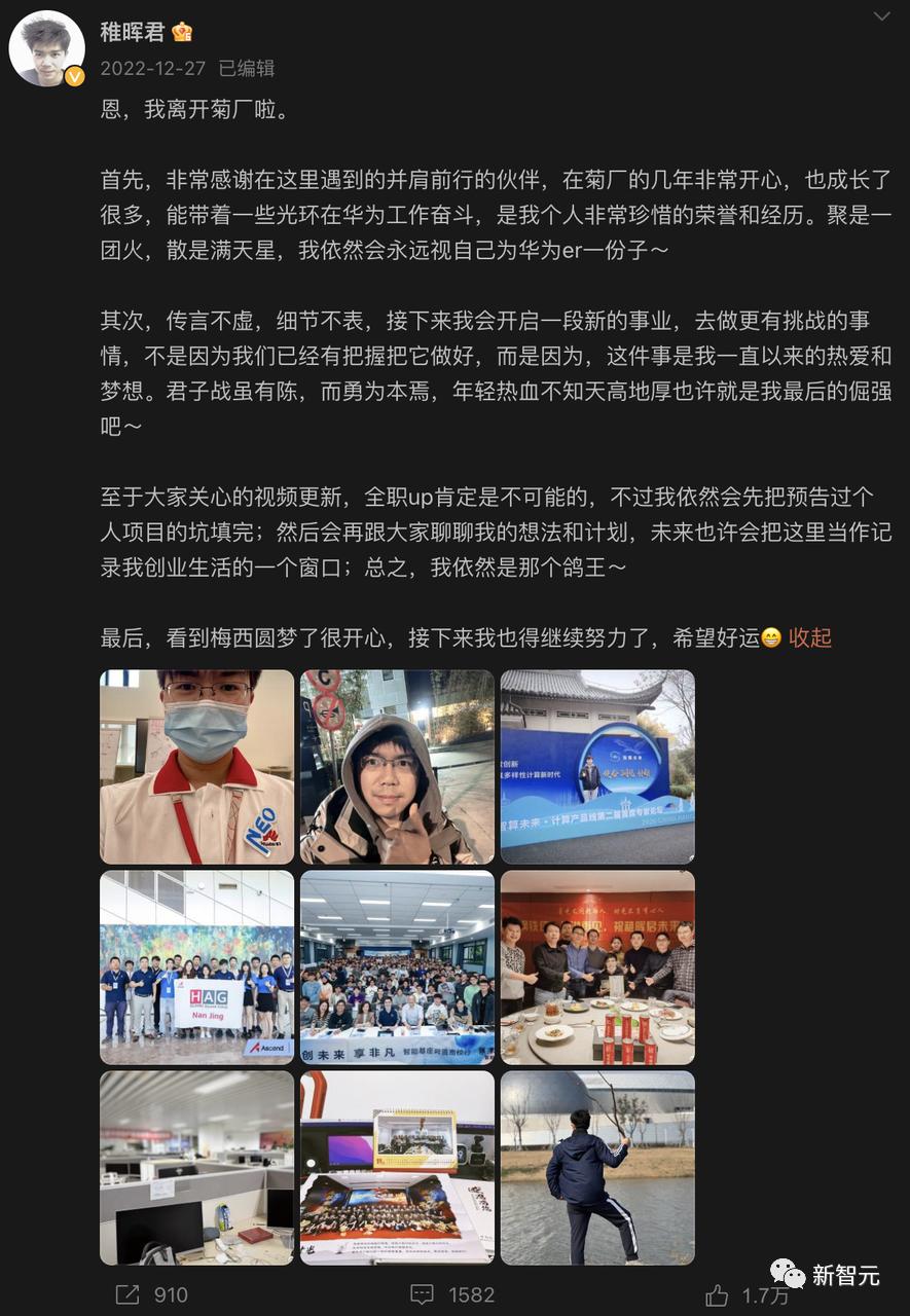 去年12月,稚晖君正式确认离开华为,表示自己接下来会开启一段新的事业。