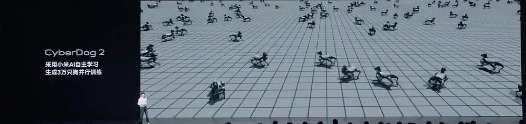 为了做出更好的仿生性,在小米的强化学习平台上,团队模拟了3万只狗进行并行训练,这样,训练效率也直接提高了3万倍。