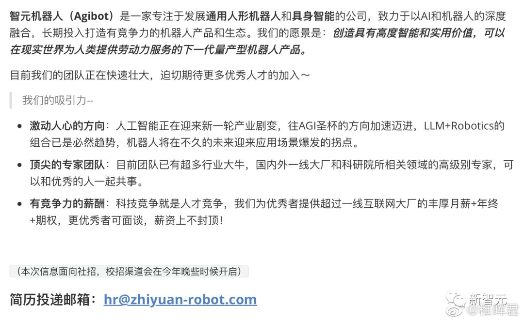 4月4日,稚晖君在微博上发布招聘信息,希望志同道合的伙伴加入,一起推动AGI机器人的实现。