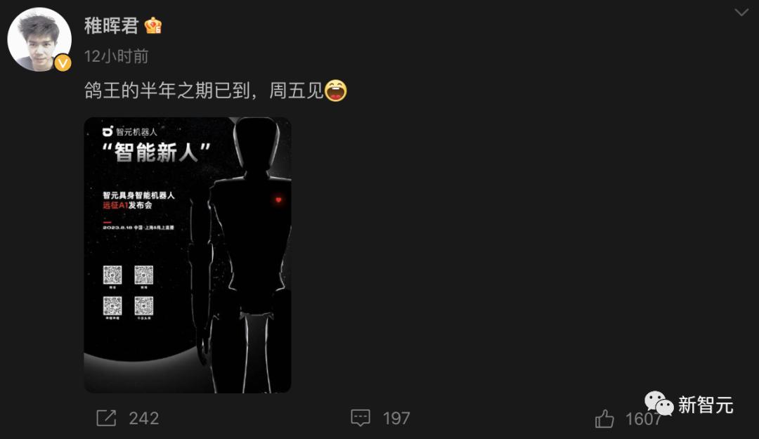 昨晚,稚晖君在微博上发出预告:智元具身智能机器人「远征 A1」,将于8月18日发布。