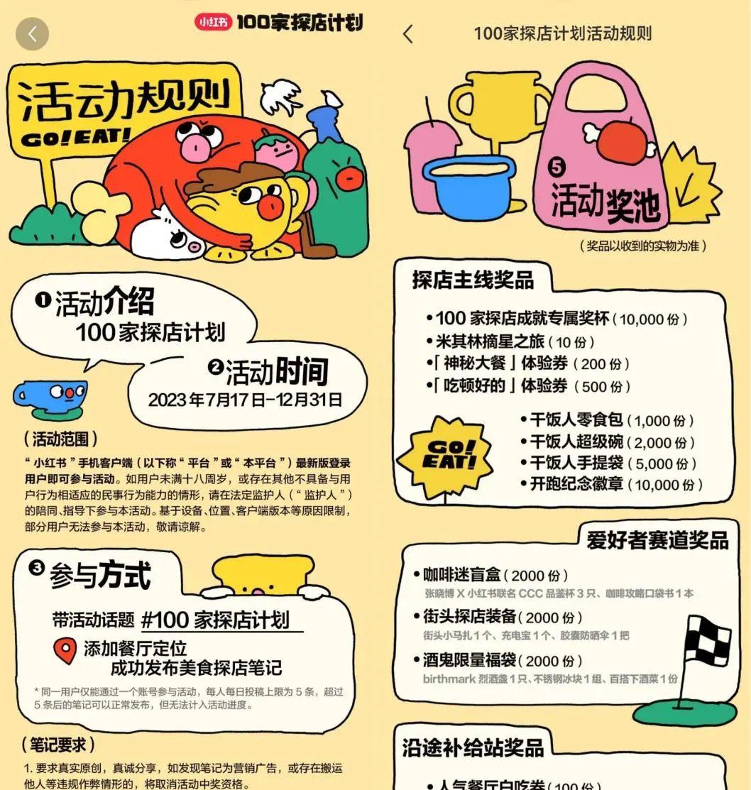 活动可以直接从小红书 App 的“活动中心”入口进入,时间从 7 月 17 日,持续到 12 月 31 日。活动的形式也很简单,发布探店笔记,带话题 #100 家探店计划 和定位,发布美食探店笔记就可以参与。