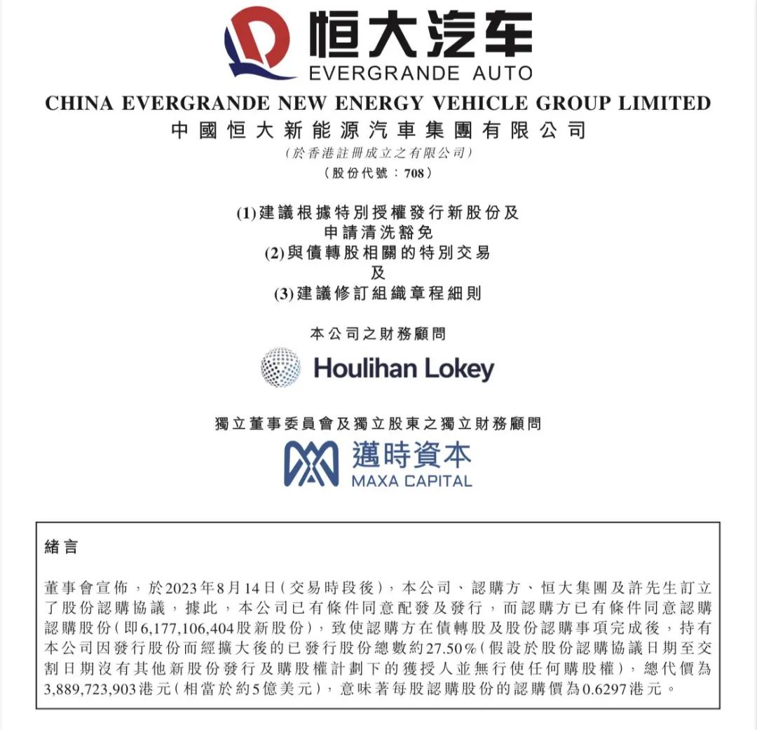 为了降低恒大汽车的债务水平,恒大汽车发布公告称,将总额208亿多港元的相关贷款按每股3.84港元的转换价转换为新股份。认购价为每股3.84港元,较每股恒大新能源汽车股份于2023年8月11日的收市价1.49港元有溢价157.7%。