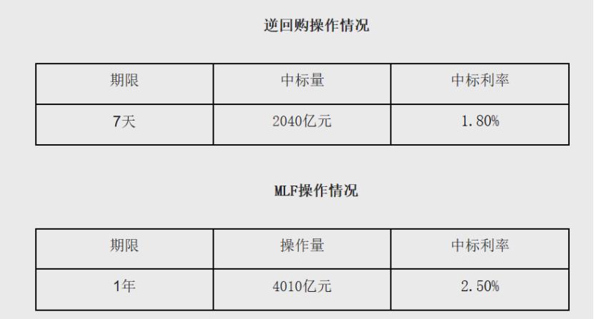 9点20分,央妈宣布公开市场开展4010亿元MLF和2040亿元7天逆回购操作,中标利率为2.5%、1.8%,上次是2.65%、1.9%。