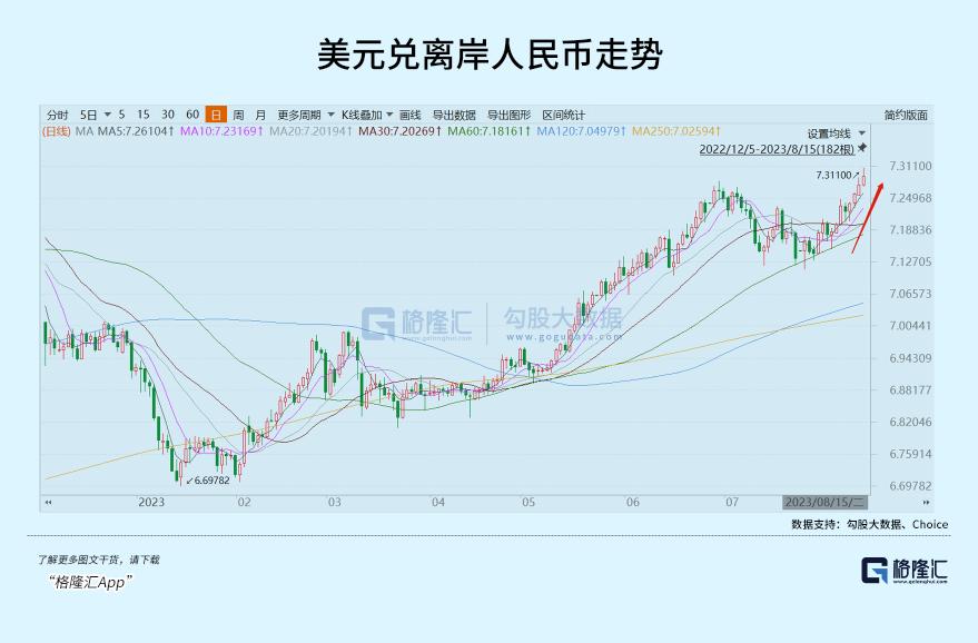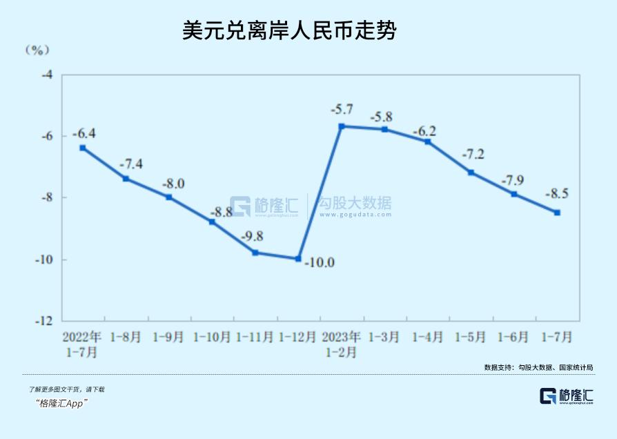 7月24日政治局至今,美元兑离岸人民币贬值1.8%。这其中的跌幅更多来源于美元指数的被动走强——期间美元大涨1.6%,一部分原因是经济数据现实较弱。