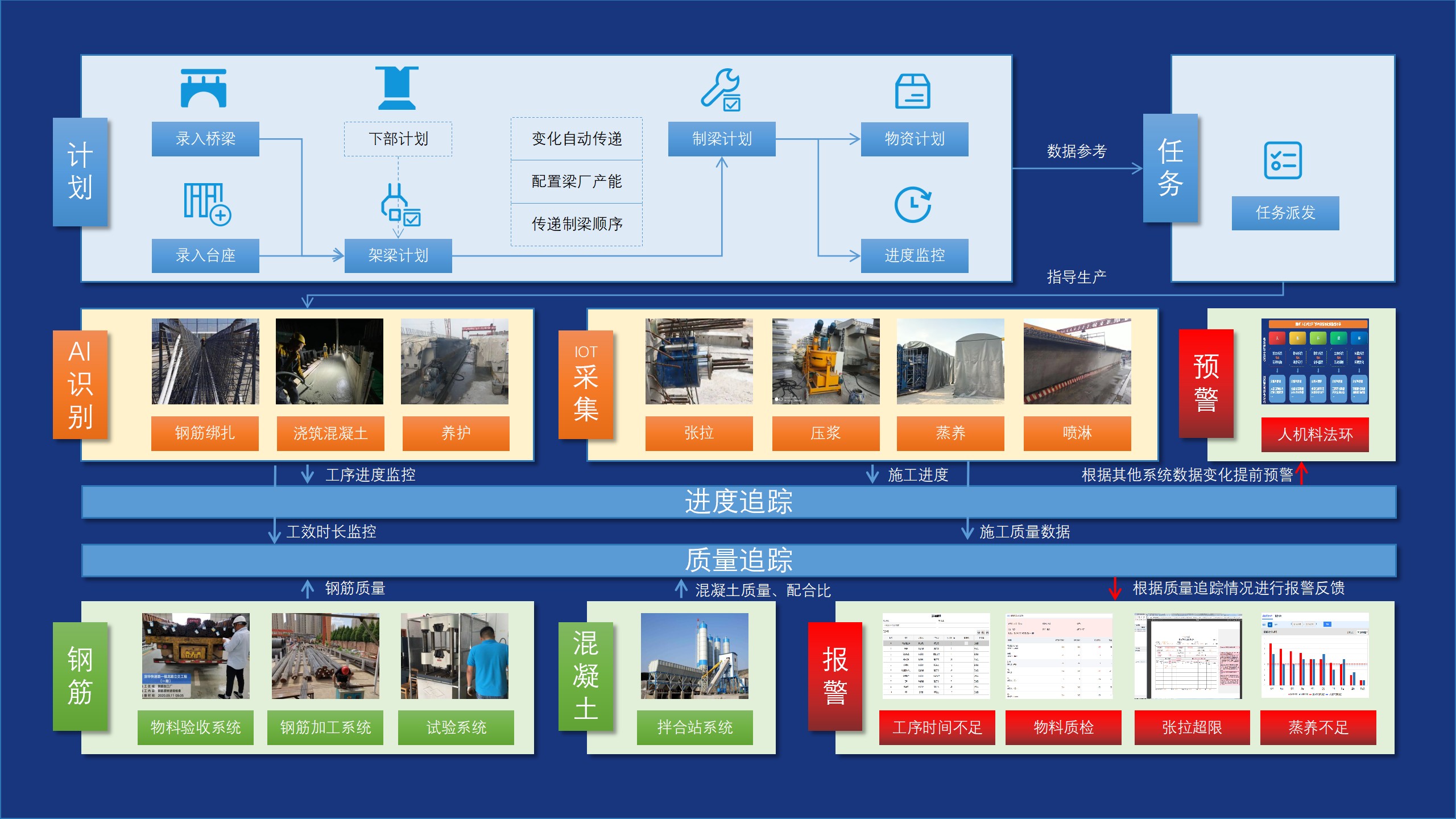 「智慧梁场」是云建信通过多个项目深度打磨出的完全标准化产品。这是一个从生产信息、进度计划、厂区管理、设备采集、数据决策实现全要素全过程数字化的解决方案。数智化预制场可承接所有设计及规范相关数据,实现从钢筋绑扎到安装全过程信息每一个构件可追溯,实时掌握所有生产相关完整的数据。