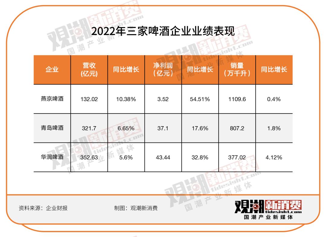 而财报数据则显示,2022年,华润啤酒高档及以上啤酒销量约210.2万千升,较2021年增长约12.6%;青岛啤酒中高端以上产品实现销量293万千升,约占全年总销量的36%,中高端以上产品销量同比增长4.99%;燕京啤酒的核心大单品燕京U8的销量达39万千升,同比增长超50%。