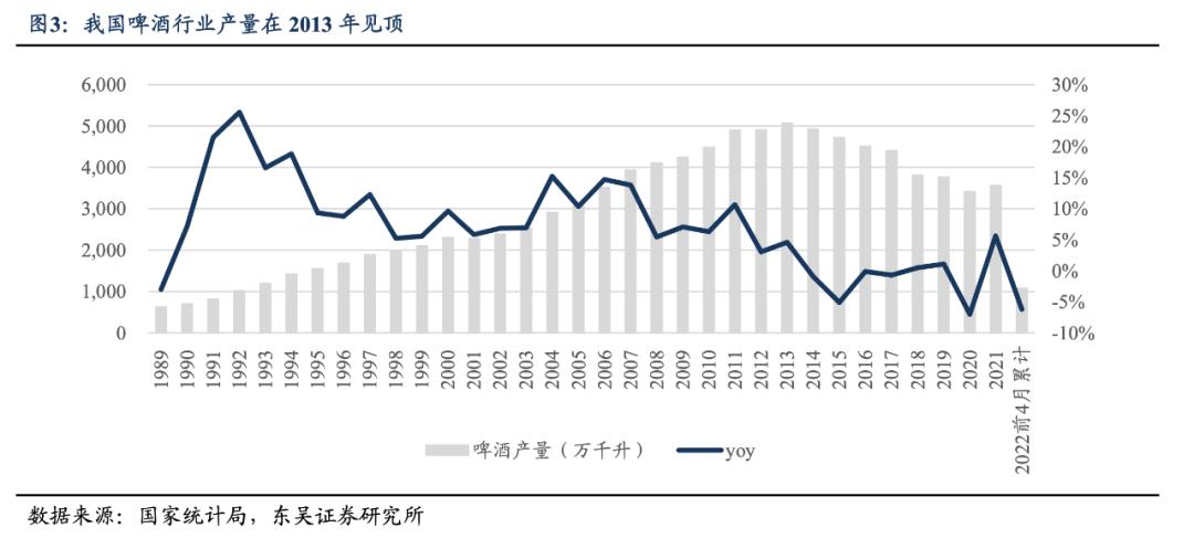 1980年-2013年,中国啤酒产量持续增长,年复合增速约为13%,最高年同比增速超过40%。2013年,国内啤酒总产量达到5062万吨的历史峰值,此后直到2020年,全国啤酒产量连续7年滑落。