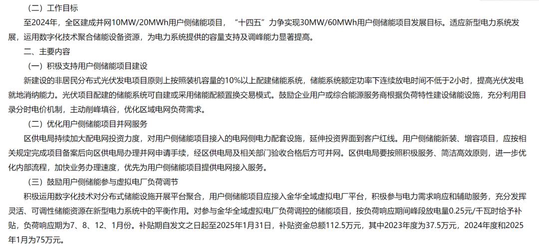 比如浙江金华金东区在出台《金东区加快用户侧储能建设的实施意见》的同时,也提出,用户侧储能项目应接入全域虚拟电厂平台,积极参与电力需求响应和辅助服务。对参与调控的储能项目,按负荷响应期间峰段放电量0.25元/千瓦时给予补贴,一直持续到2025年1月31日,补贴总额112.5万元。
