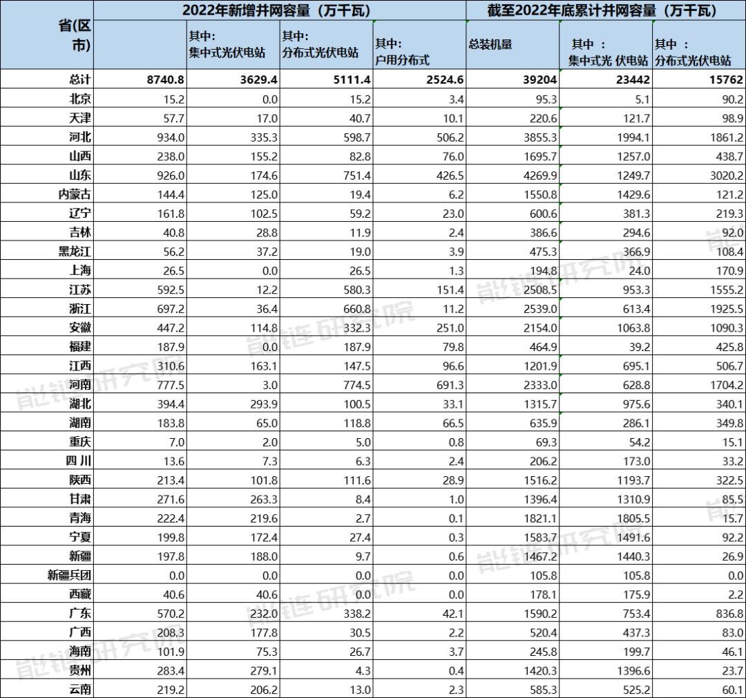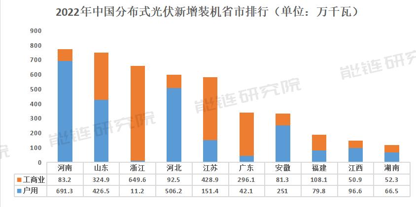 2022年,国内光伏新增装机中,河北、山东、河南、浙江、江苏排在前五位,但河南7.8GW的新增装机中,几乎全部为分布式光伏,只有0.39%是集中式光伏,其中户用光伏又占到了90%。