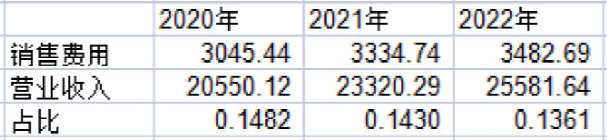 2020年至2022年,A股医药生物公司销售费用占营业收入的比例分别为14.82%、14.3%、13.61%。