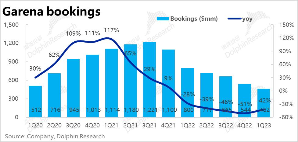 导致用户规模虽然回升,但Garena本季确认的流水仍在环比下跌,本季为4.6亿元明显低于上季度的5.4亿元。但无论如何用户回升是后续流入和收入回暖的前提。从同比增速来看,本季流失下跌了42%,跌幅较上季已有所缩窄,同样表明游戏板块的拐点可能正在到来。