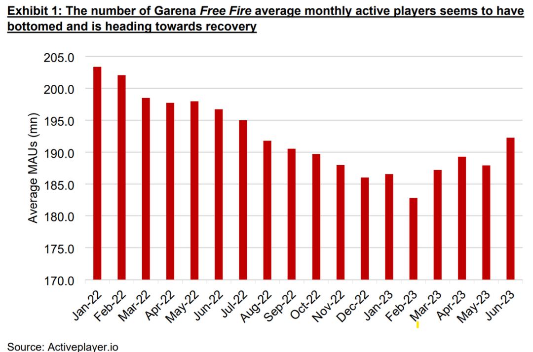 首先,根据第三方高频数据,Garena旗下最重要的游戏Free Fire的月活用户数量自23年3月以来就开始持续地回升。