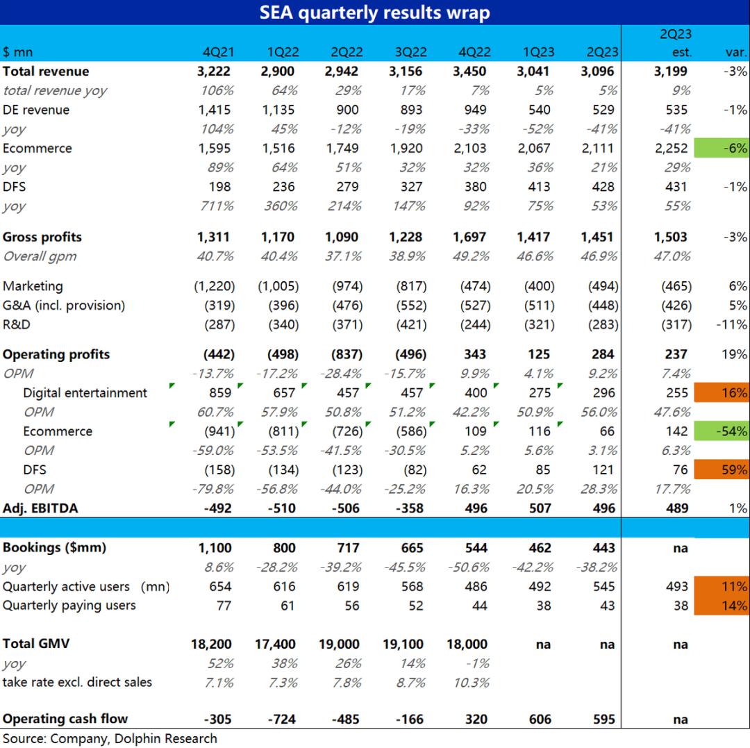 对应着公司希望重新拉升电商板块的增长,以及吸引玩家回归Garena旗下游戏的目标,可以看到本季度公司的营销费用开始扩张。其中电商板块的营销费用率从上季的16%明显增长到20%,确认公司的确增加了推广或给消费者的补贴。游戏板块的营销费率也环比从4%略微增加到5%。因此本季营销费用总支出为4.9亿美元,高于预期的4.7亿,可见投入力度比预期的更强。