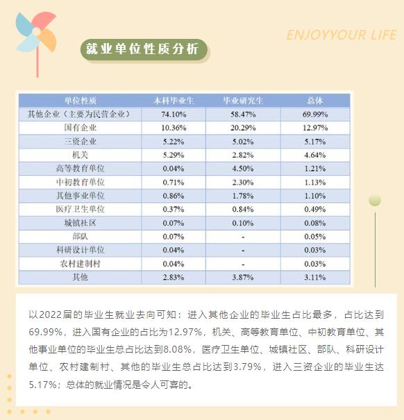 到了2022届的毕业生,进入其他企业的毕业生占比增多,占比达到69.99%,进入国有企业的占比为12.97%,机关、高等教育单位、中初教育单位、其他事业单位的毕业生总占比达到8.08%,进入三资企业的毕业生达5.17%。