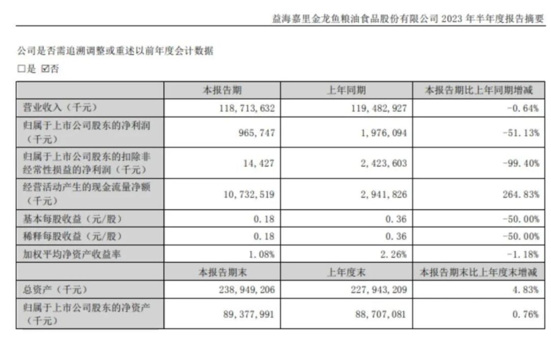 近日,“油茅”金龙鱼(益海嘉里金龙鱼粮油食品股份有限公司)交出上市后最差“中报”。今年上半年,金龙鱼营业收入1187.14亿元,同比减少0.64%;净利润为9.66亿元,同比减少51.13%;扣非净利润为0.14亿元,同比减少99.40%;毛利率仅为7.53%,同比减少3.38个百分点。