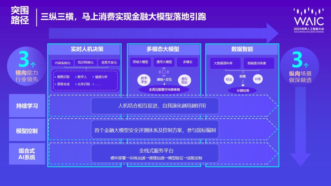 基于这些特性,蒋宁表示,为实现大模型落地领跑,马上消费制定了“三横三纵”战略,形成了独特的方法论。