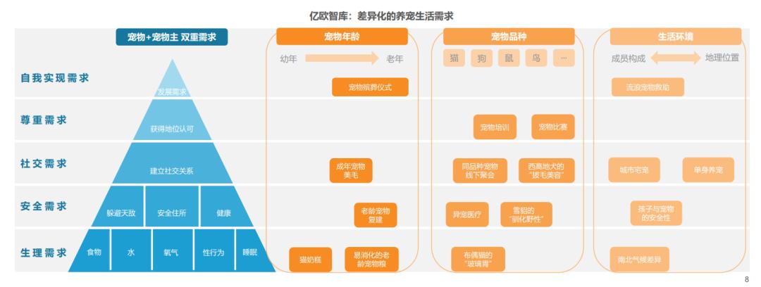 随着养宠群体的快速增长,在满足养宠刚需的前提下,根据马斯洛需求层次模型,将从物质需求向精神需求升级,不断会有新的改善性需求出现。值得注意的是,这里的需求不单单是宠物的需求,还包括了主人将自身情感投射到宠物身上的需求。改善性需求的发展路径呈多个方向:环境各异的个人生活场景、日益繁多的宠物品种、漫长而复杂的生命成长全周期。