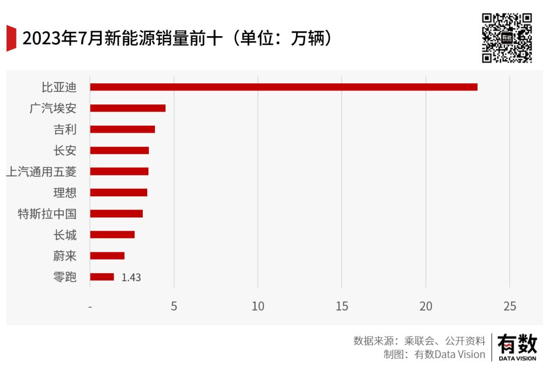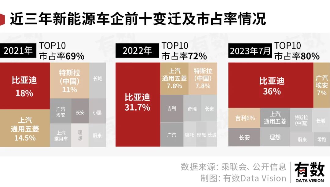 领先品牌的销量逐渐增长,最终则体现在市场集中度迅速提升,从乘联会公布的7月数据来看,前十榜单的销量集中度已经高达80%。