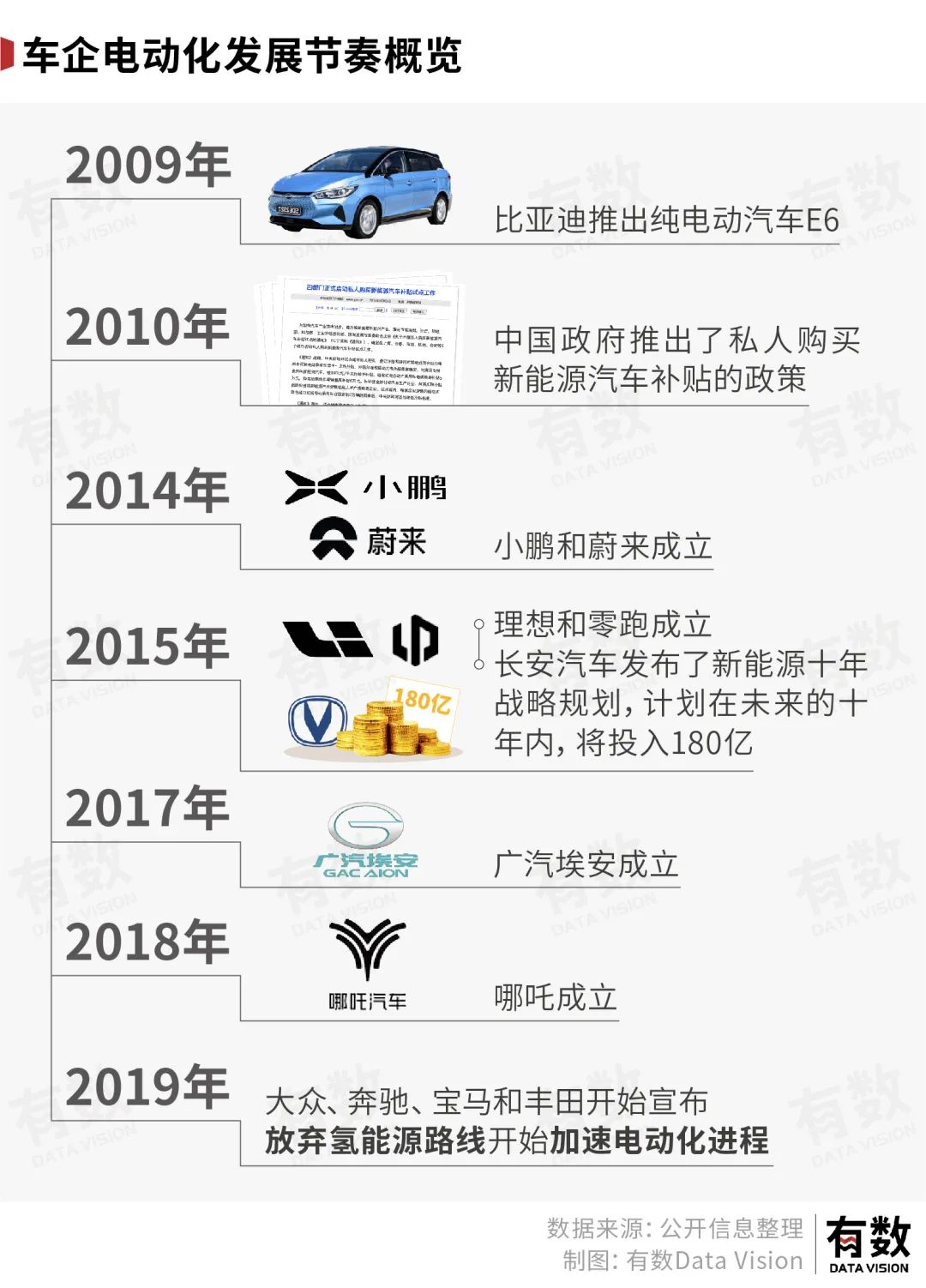 与此同时,中国的电动化进程正在迅猛发展,早在2009年,电动化路线的先驱者比亚迪就已经推出第一款纯电车E6,次年追随者吉利推出了吉利帝豪EV,新能源车购车补贴也在2010年推出,新能源车渗透率由此开始加速。