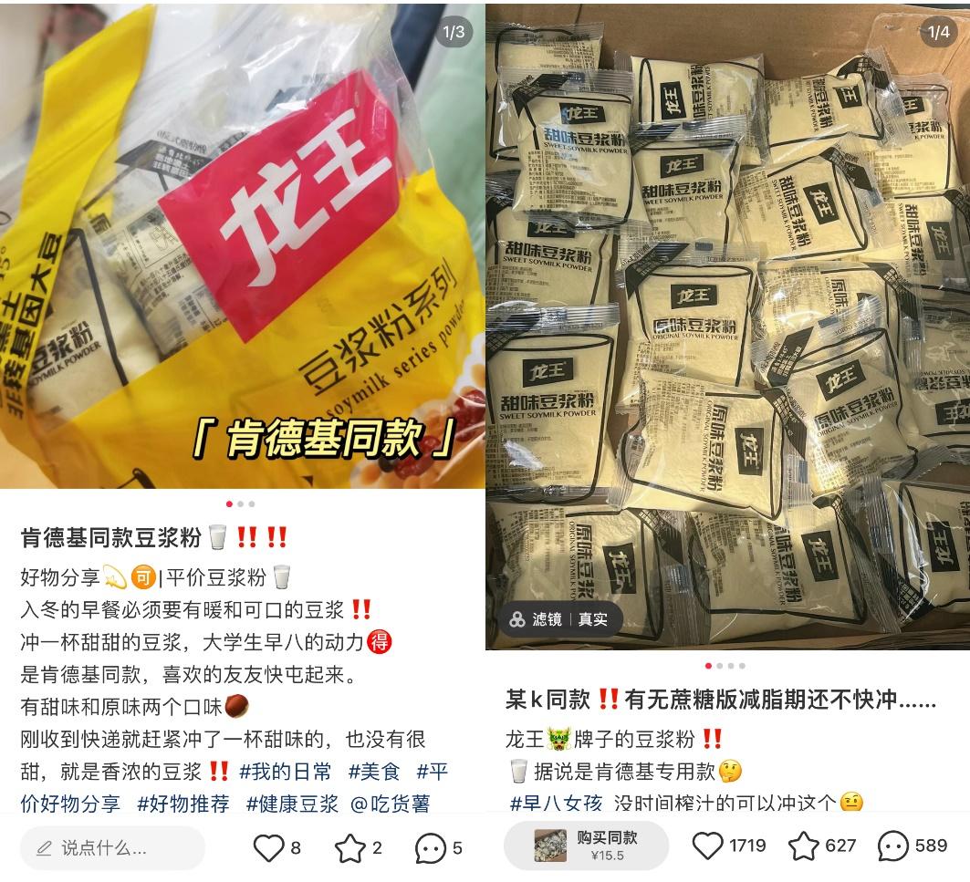 “某K同款”“教你实现肯德基豆浆自由”“我不会是最后一个知道肯德基豆浆供应商的人吧”……诸如此类的帖子被博主们当做流量密码使用,而龙王豆浆也在这股挖掘“平替”或供应商的潮流中走进了C端消费者的视线。