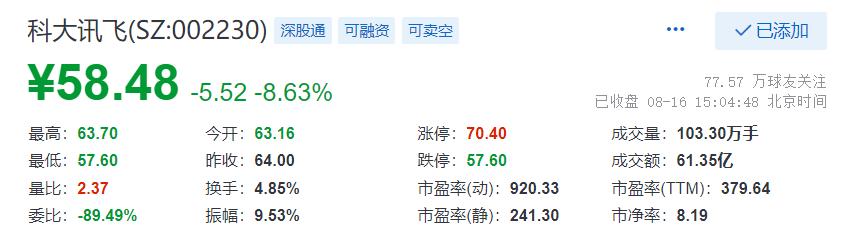 今日(8月16日),科大讯飞开盘便遇大跳水,盘中触及跌停板,报收58.48元,跌幅达8.63%