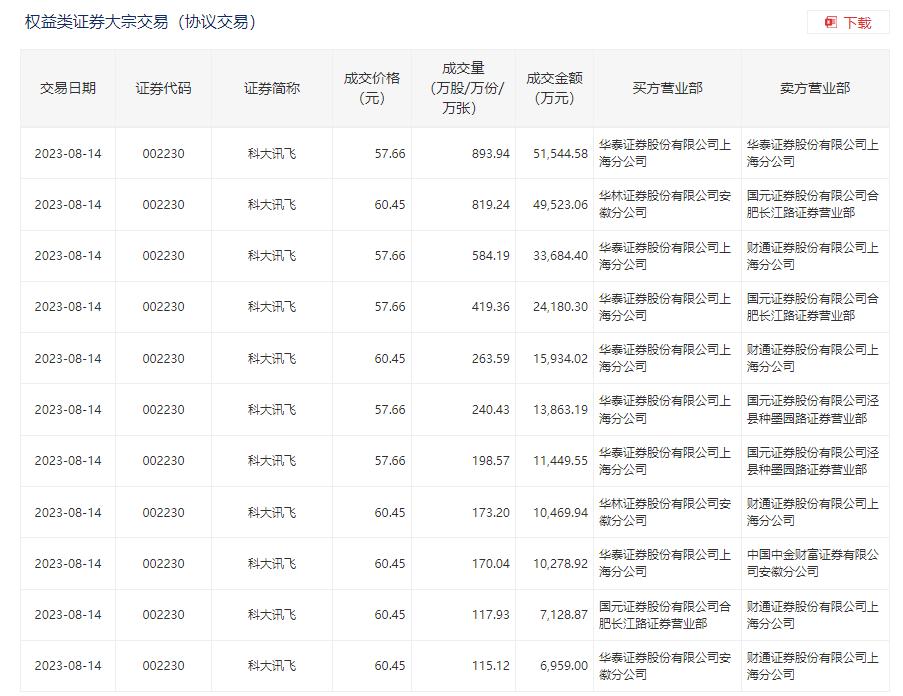 据盘后交易所披露的公告显示,14日,科大讯飞大宗交易成交3995.6万股,成交额23.5亿元,与刘庆峰减持股数相当。