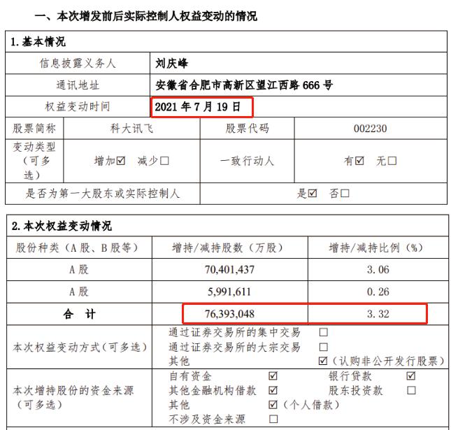 翻阅2021年7月的定增公告可知:2021年7月19日,科大讯飞非公开发行不超过7639万股股份,发行价格为33.38元/股,募资约25.5亿元,发行对象为刘庆峰及其控制的言知科技。