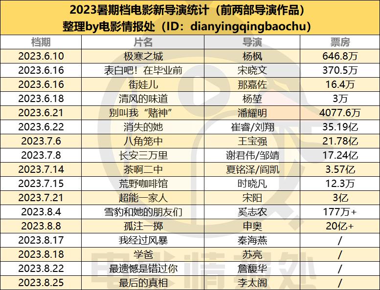 鉴于此,情报君统计了今年暑期档上映的部分新导演作品(特指前两部作品),主要以那些市场有讨论度的片子为主,得到了下面的表格。