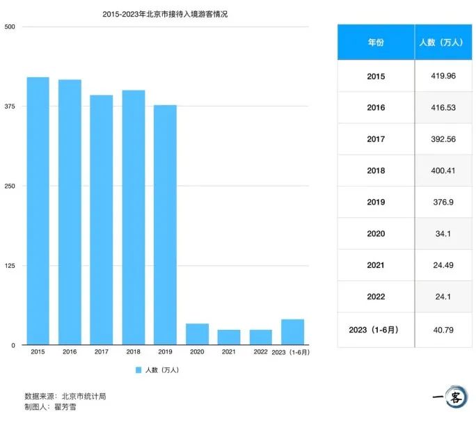 北京市统计局数据显示,1-6月,北京市入境游客仅为40.79万人,尽管已是2022年全年的两倍,但不到2019年全年的11%。