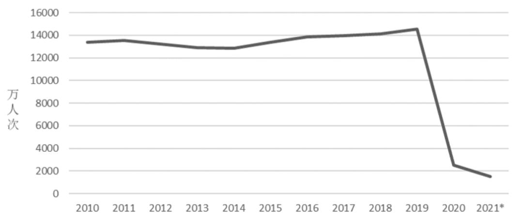 2010-2021年我国入境游客接待情况(数据来源:中国旅游研究院)注:由于缺乏官方数据更新,全国入境游客数量只统计到2021年
