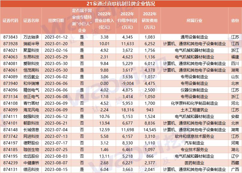 挖贝研究院数据显示,截至目前,长城信息、瑞能半导、万达轴承、海龙风电、创正电气等21家企业通过直联机制在新三板挂牌,且企业质地都不错,其中8家企业目前已处于北交所上市辅导期。