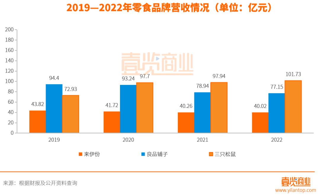 来伊份从2019年起陆续开展了综艺节目赞助、IP联名营销,鲜制零食品牌战略等各类活动。然而,这些努力总体上收益并不大,来伊份近四年的营收规模都没有发生大的变动。