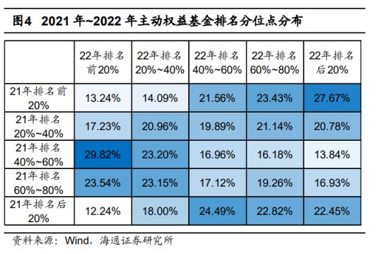 下面的图是2021年业绩排名五个20%档的基金,假设你在2022年初去买基金,大概率会买到第一排(业绩排名前20%),但它们中有28%的概率变成业绩最差的一档,只有13%的概率还留在最好的一档。