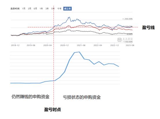 但从下半部分的基金规模与业绩对应关系看,绝大部分份额是在高位申购的,目前基金的净值已经跌到2020年6月的水平,就算2020年6月以前的申购资金都没有卖出,目前持有基民也只有20%是盈利的。