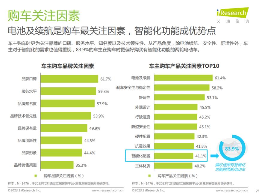 从艾瑞咨询的调研来看,用户最关注的还是电池续航、安全性、舒适性。但同时,对于对于智能化的需求也在快速攀升,有83.9%的车主在购车时更偏好购买有智能化功能的两轮电动车——翻译一下就是,既要玩得爽,又要骑得爽,还要够安全。