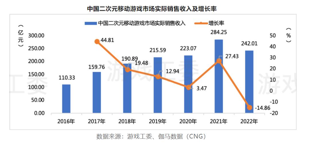 去年的报告显示,2022年中国二次元移动游戏市场实际销售收入为242.01亿元,同比下降14.86%。下降主要原因是缺乏现象级新品游戏,目前头部二次元移动游戏大多处于运营稳定期而非收入较高的爆发期。