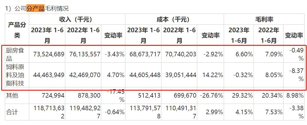其中,厨房食品毛利率下滑0.49个百分点,饲料原料及油脂科技毛利率更是下滑8.37个百分点至-0.32%。