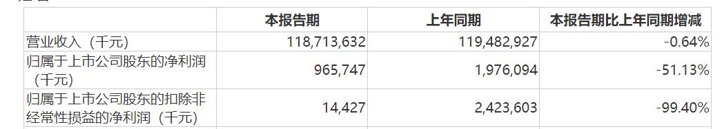 报告期内,企业实现营业收入1187.14亿元,同比下滑0.64%;归母净利润9.66亿元,同比下滑51.13%。