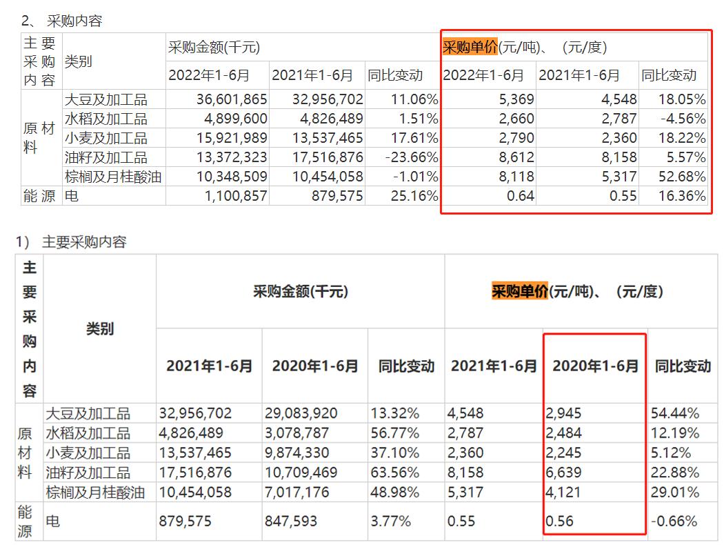 金龙鱼财报显示,2020年上半年-2022年上半年,大豆及加工品的采购单价分别为2945元/吨、4548元/吨、5369元/吨。