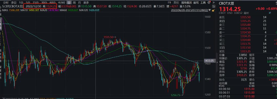 wind数据显示,CBOT(芝加哥交易所)大豆从2022年12月30日的收盘价1524.25美分/蒲式尔下滑到2023年6月30日的1342.50美分/蒲式尔,累计下滑约12%。